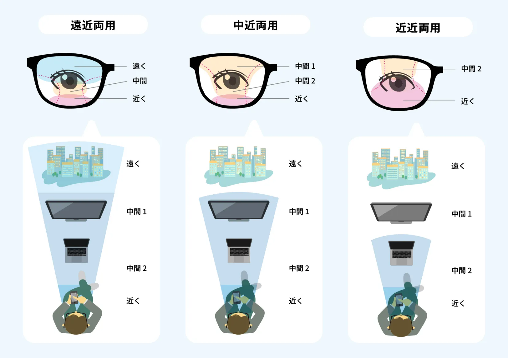 両用レンズは「遠近」だけでなく、「中近両用」「近近両用」3種類の距離に対応。